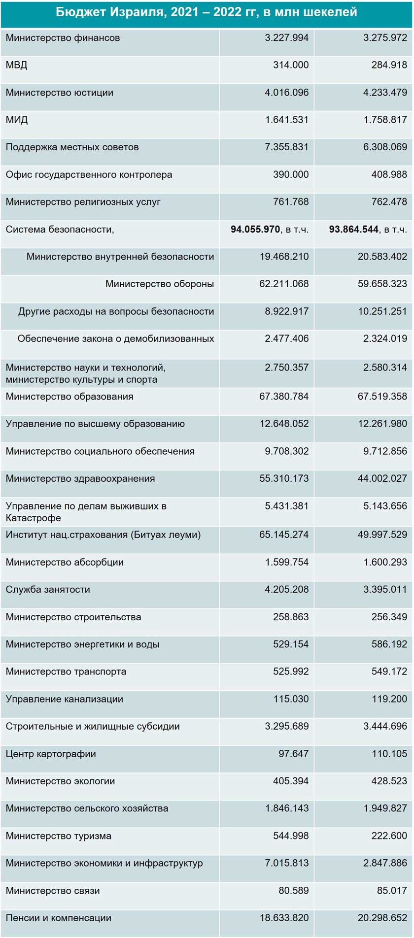 В бюджетах крупных ведомственных штабов встречаются статьи «резерв», но они не у всех обеспечены деньгами. Например, резерв президентского офиса – около 2 млн. шекелей в год, а резерв минфина – 131.4 млн шекелей в 2022 году. Правительство продолжает расплачиваться по долговым обязательствам и процентам по ним — на эти нужны в 2021 году отдадут 122.9 млрд шекелей, а в 2022 году – 125.6 млрд шекелей.