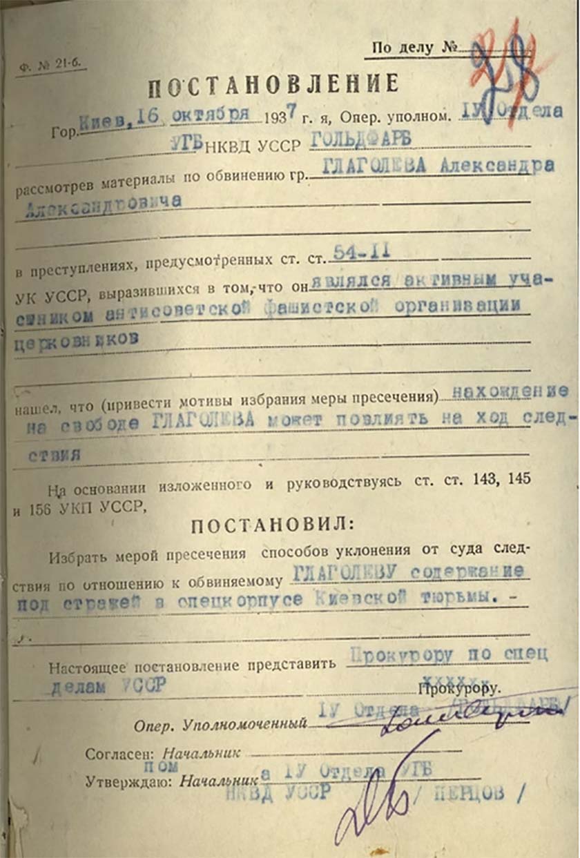 Следствие по делу киевских священнослужителей вел оперуполномоченный 4 отдела УГБ НКВД УССР Зуся Гольдфарб. Ни одного протокола допроса протоиерея Глаголева в деле нет. Имеется лишь несколько «собственноручных» заявлений. В первом из них говорится, что Александр Глаголев в начале 1936 года «вошел в круг контрреволюционных настроений и устремлений», применявшихся в объединенной церковной практике. Это заявление обрывается на середине предложения.