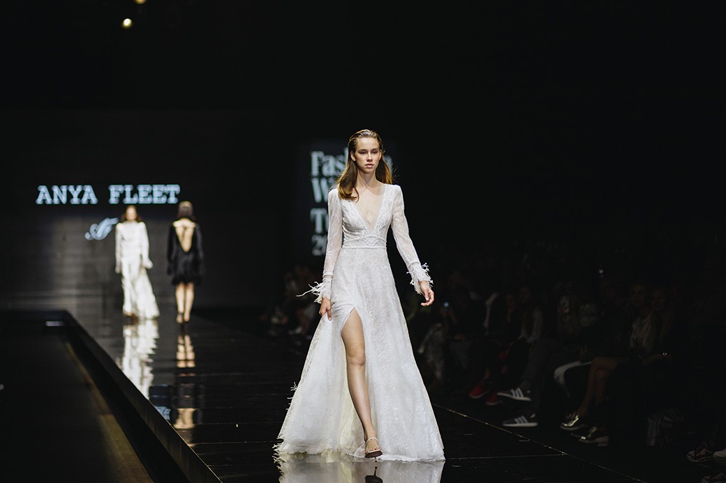 Третий показ от дизайнера Аnya Fleet покорил меня в самое сердце, став настоящей одой женственности. Все в нем было пропитано вниманием и любовью к красоте. Переливы шелка, тончайшие паутинки кружев, жемчуг, перья и нежнейший стеклярус, буквально заворожили зрителей, а прекрасный крой и филигранная портновская работа не давали оторвать взгляд от подиума.