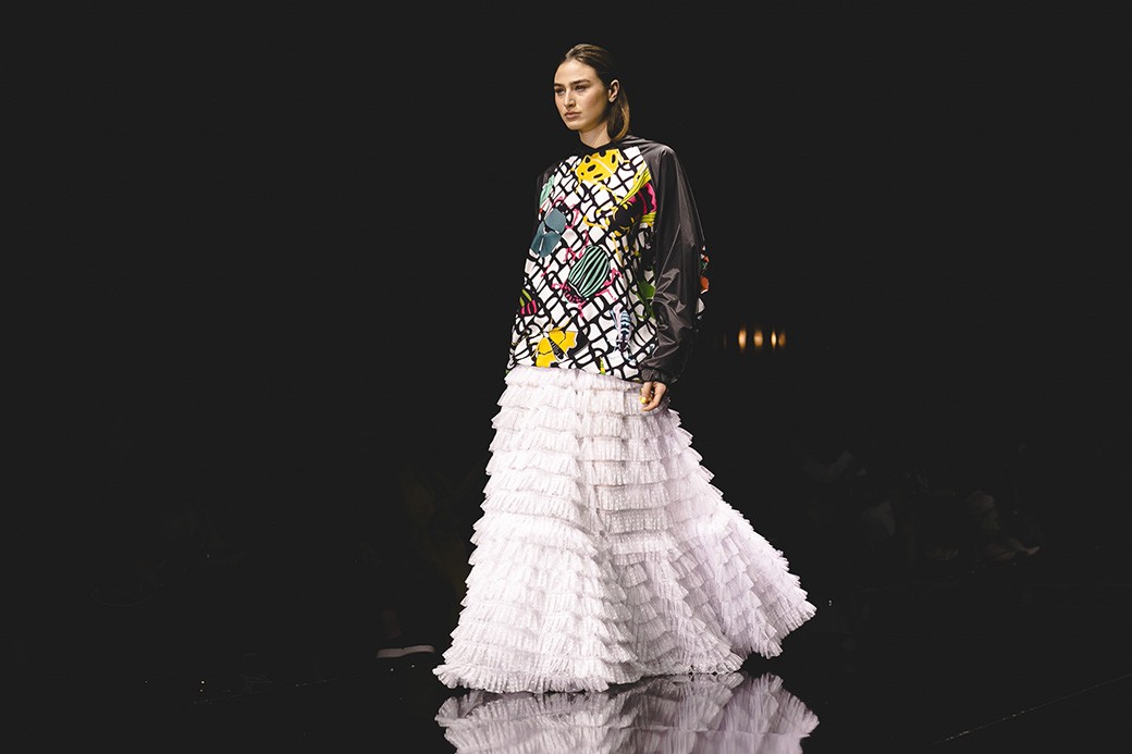 Девиз современной моды: «Сочетай несочетаемое», поэтому спортивные куртки-бомберы подружились с шортами с мелкими рюшами, а у свитшотов появились рукава, щедро украшенные пайетками. Черные платья и костюмы в крупный разноцветный горох лейтмотивом прошли через всю коллекцию, придав ей нотку игривости, напоминая нам о том, что частичка детства живет в каждом из нас.