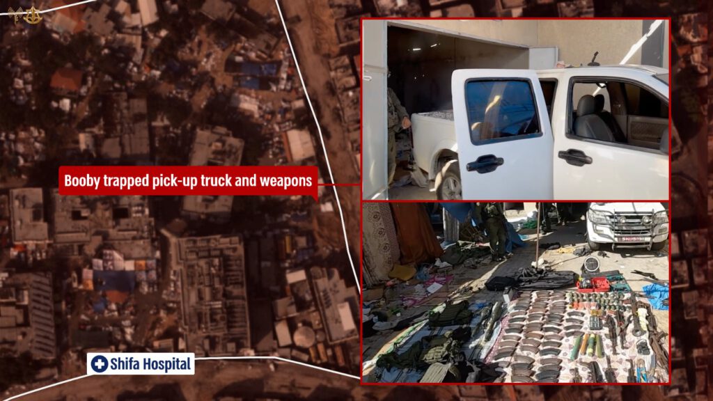 Израильские военные обнаружили под больничным комплексом «Шифа» укрепленный террористический тоннель длиной 55 метров. Вертикальный спуск в тоннель располагался на территории больницы, под навесом. Рядом был найден автомобиль, забитый оружием, включая РПГ, взрывчатку и автоматы Калашникова.