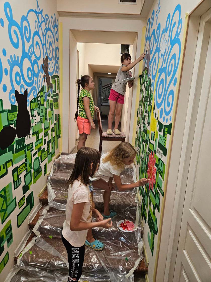 Потом 1-2 дня художница и волонтеры работают вместе с детьми. В последний день Зоя доводит рисунки до, как она выражается, «эстетически приемлемого финиша».