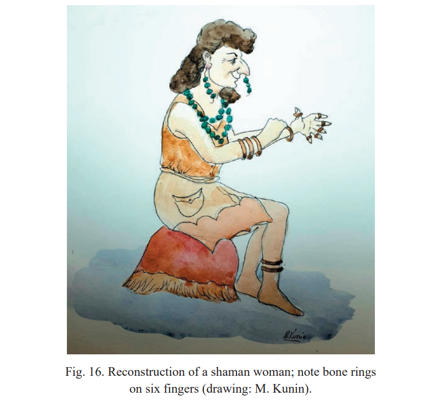 О высоком социальном статусе похороненной свидетельствуют найденные при ней перламутровые украшения и бусы из зеленого камня. По мнению археологов, она была шаманкой или колдуньей.