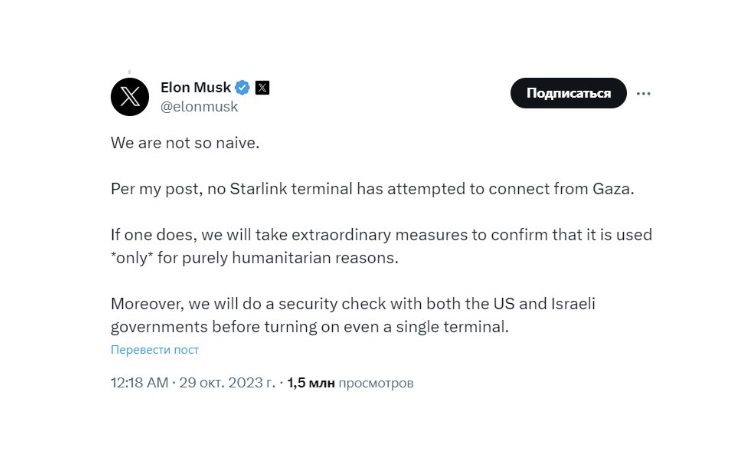 В ответ на угрозы министра связи Израиля Шломо Караи разорвать все отношения со Starlink из-за готовности Илона Маска предоставить в сектор Газа терминалы спутниковой связи Starlink, американский бизнесмен написал в сети Х (ранее Твиттер), что не настолько наивен и что будут приняты «чрезвычайные меры», чтобы удостовериться, что систему используют исключительно для гуманитарных целей.