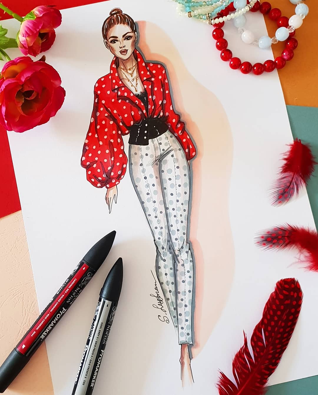 Крупный горох визуально увеличивает ту часть фигуры, где он находится и привлекает к ней внимание. Если бедрам не хватает объема – смело выбирайте юбку, брюки или шорты в крупный горох. По тому же принципу, если необходимо, добавляем объем в верхней части фигуры, отдав предпочтение топу в горох. Отмечу, что мелкий горошек считается нейтральным принтом и будет уместен даже в деловом гардеробе, он подходит практически всем!