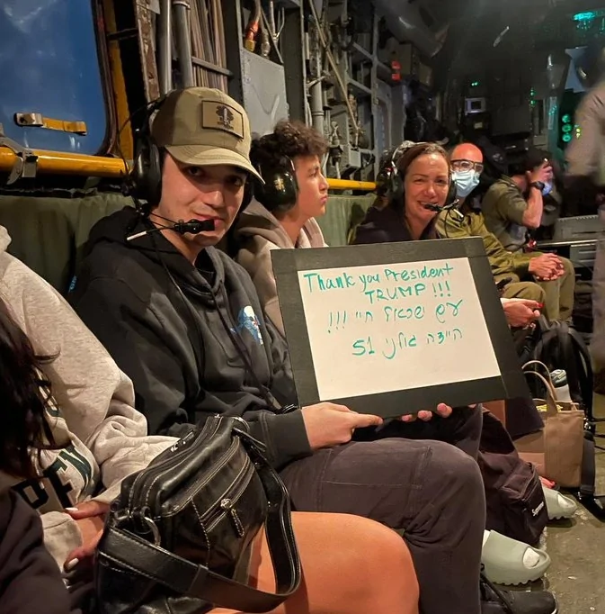 На фото из вертолета Идан держит в руках табличку с надписью на английском и иврите: «Спасибо, президент Трамп! Народ Израиля жив!». На голове у молодого человека кепка с эмблемой его подразделения — бригады «Голани».