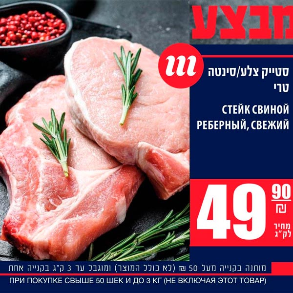 - Стейк свиной реберный 49,90 шекелей за килограмм*;