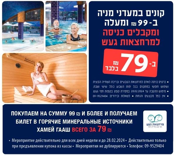 Любимое мероприятие наших покупателей вернулось и продлится до 30.01.24. При покупке продуктов в сети на сумму от 99 шекелей вы получаете возможность приобрести билет в горячие минеральные источники Хамей Гааш всего за 79 шекелей* (вместо 100 в рабочий день или 110 в выходной).