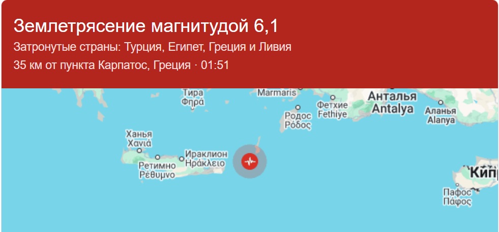 Судя по всему, эпицентр землетрясения находился рядом с греческим островом Крит. Там в 01:51 было зафиксировано землетрясение магнитудой 6,1. О нем сообщил Германский исследовательский центр геонаук (GFZ).